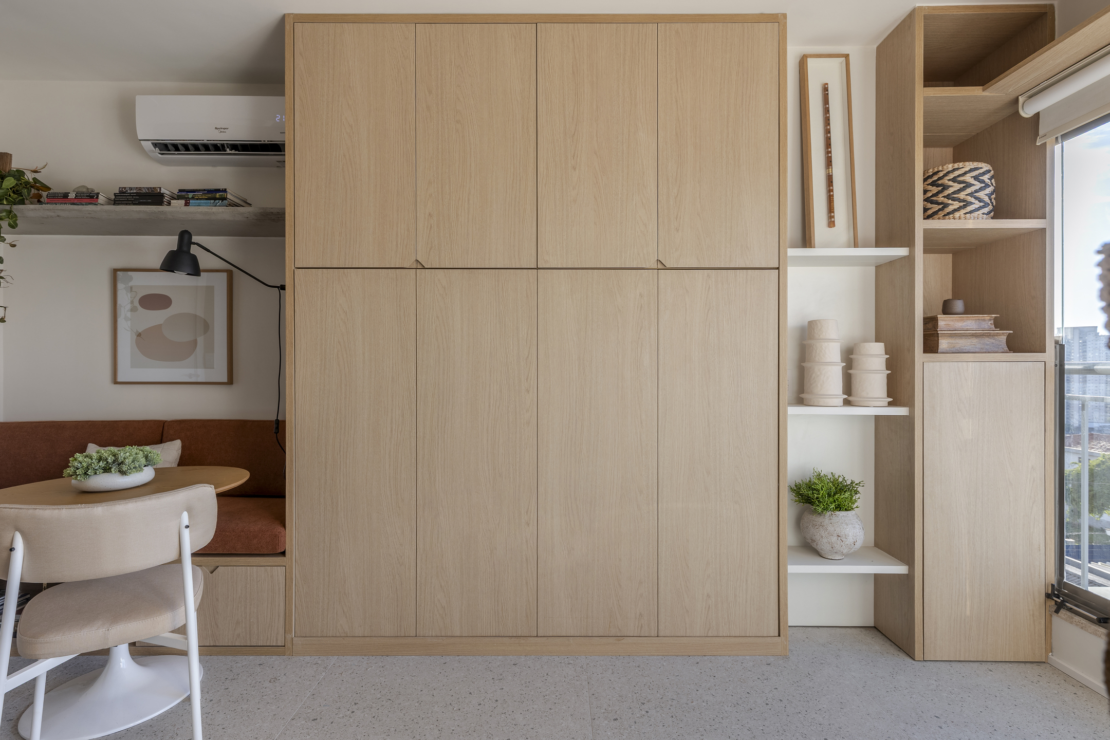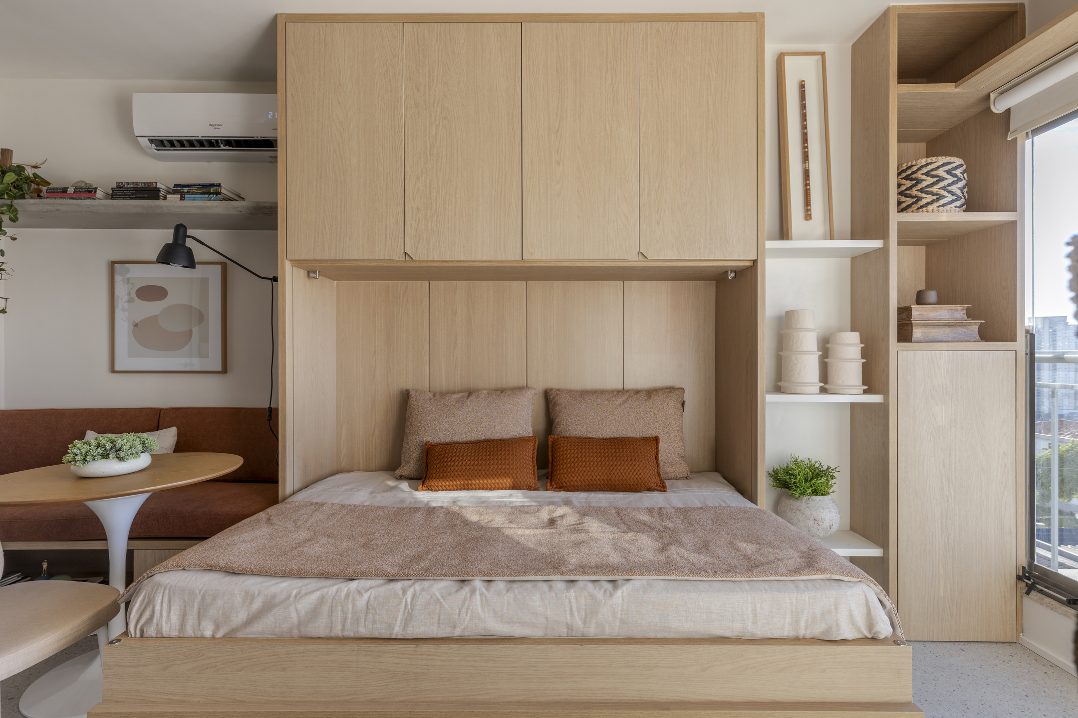 A espacialidade foi ampliada através da integração da varanda à área interna, promovendo uma circulação livre e otimizada. A marcenaria planejada em carvalho-americano é o elemento unificador, conferindo conforto e leveza para o ambiente. A solução mais emblemática é a cama retrátil, que, quando recolhida, se camufla completamente na marcenaria, transformando o quarto em uma extensão da área social.