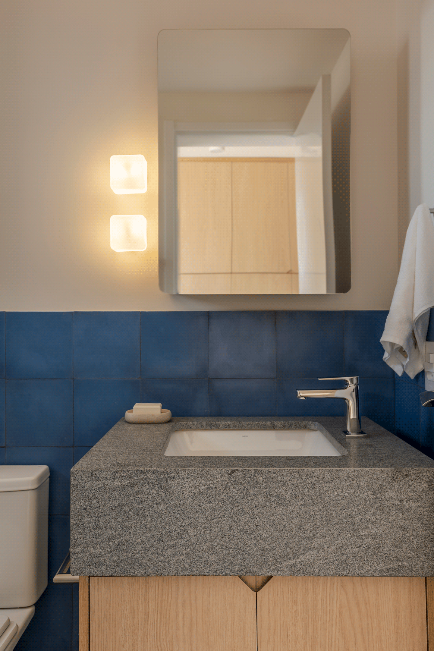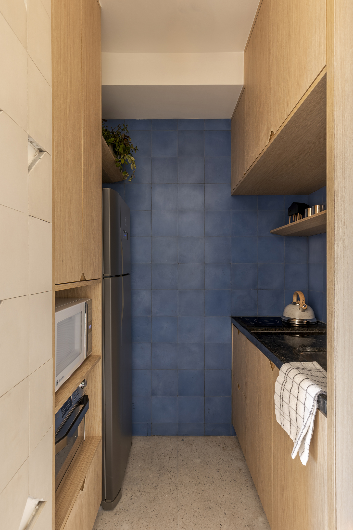 Na cozinha e no banheiro, os ladrilhos hidráulicos azuis conferem cor e profundidade, enquanto os puxadores do tipo "cava" mantém as superfícies limpas e contínuas. O home office, estrategicamente posicionado próximo à janela, aproveita a luz natural e conta com uma estante colorida que organiza e personaliza o cantinho de trabalho.
