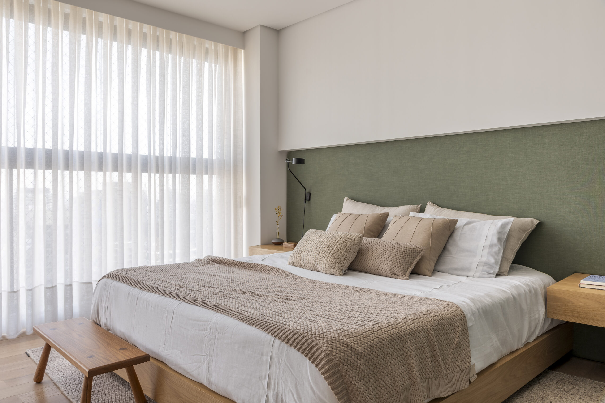 Especialista em projetos contemporâneos, Raphael Wittmann acredita que a paleta deve ser pensada de dentro para fora, refletindo a identidade de quem dorme ali. Por isso, sugere uma base em tons claros e neutros, como bege, branco, areia, cinza mais quente e verde-oliva, que evocam serenidade e ampliam visualmente o ambiente. Outras cores podem ser utilizadas de acordo com o gosto pessoal, mas devem ser acolhedoras. Para contrastar, tons mais marcantes podem ser usados pontualmente em objetos ou paredes de destaque.
